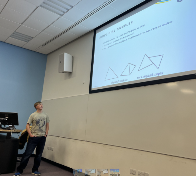 The annual Mathematics, Physics and Space Postgraduate Research Conference was held last week (on Thursday 29 January). The Principal Organiser was Esha Joshi. Vasilis Moustakis helped with consultation on the abstracts. Dr. Stanislaw Biber and Dr. Payel Das were the ECR guest speakers. Dr Stanislaw Biber and Dr Alexia Beale were the co-judges. This event showcases the research of current PhD students. The prizewinners were Dan Catlin (Maths), Zak Marshall (Physics), and John Papoudos (Space). The first photo below shows (L-R) the three winners, the organiser, and the co-judges. The second photo below shows Owen Pennington giving his talk. The complete set of photos can be found on the onedrive (link here).